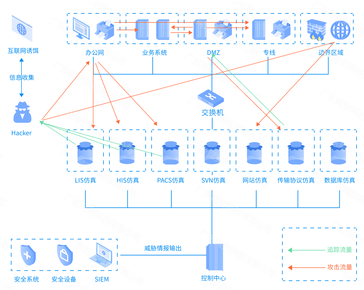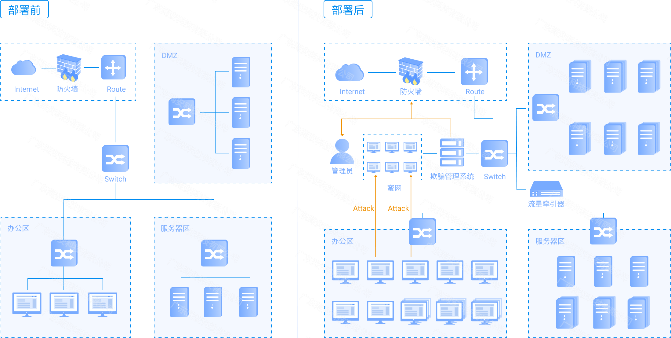 攻擊欺騙誘捕防御系統(tǒng)基于網(wǎng)絡(luò)欺騙和主動防御理論,通過蜜罐、蜜餌等構(gòu)建沉浸式誘捕蜜網(wǎng),混淆攻擊視聽,增加攻擊代價,達到延緩攻擊進程,進而保護用戶資產(chǎn)的目的。